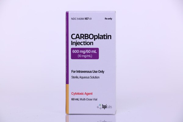 CARBOPLATIN 600MG/60mL VIAL (DOES NOT CONTAIN MANNITOL / ONCOLOGY) NDC: 54288-0167-01 FORMAT: 60MLMANUFACTURER: BPI LABS Quantity discounts available QuantityPrice Limited shelf life; product will expire soon. Please log in to see price or purchase this item